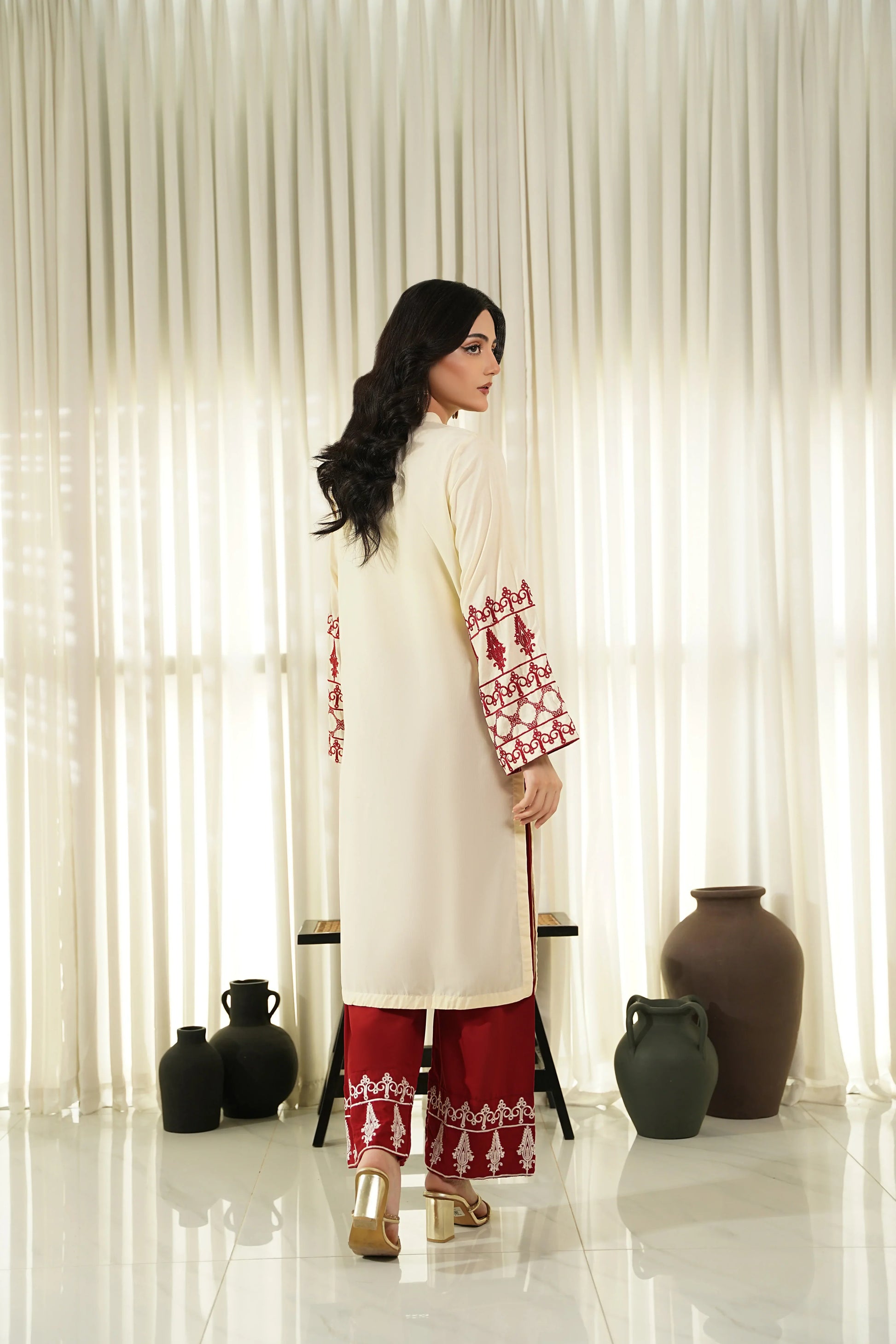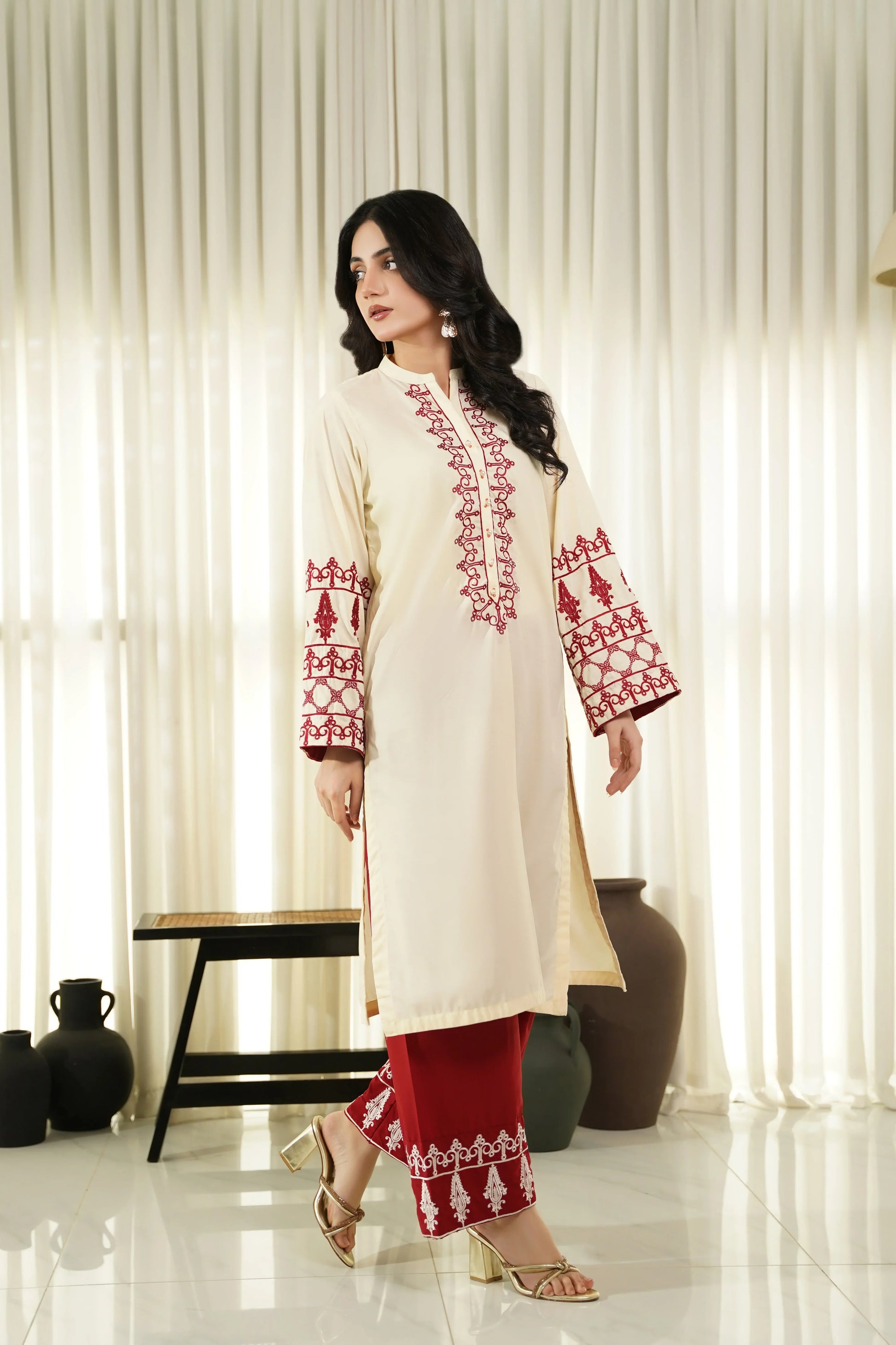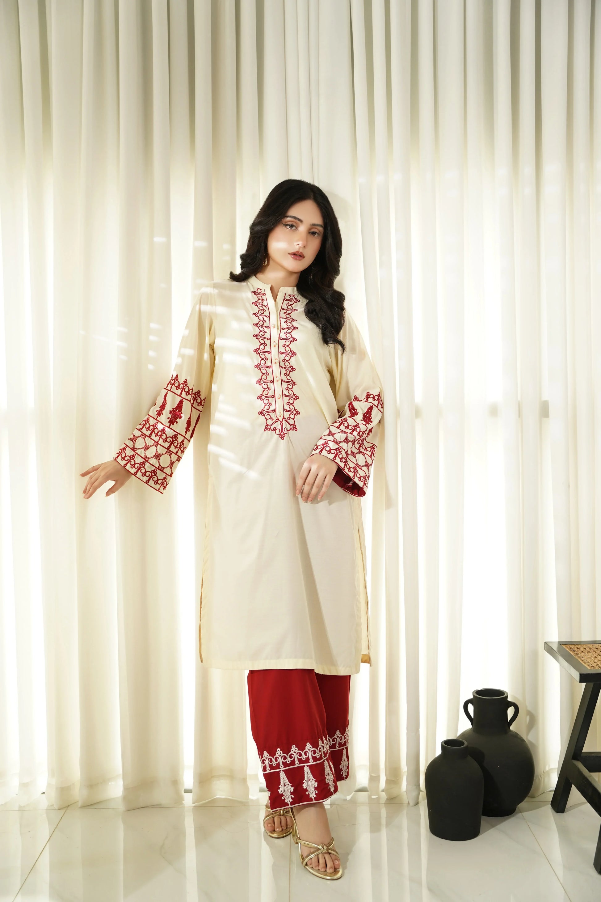This article consists of a solid 2-piece set with an intricate embroidery detail touch on the shirt. The outfit consists of a long-length style shirt and fitted pants.