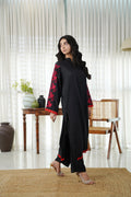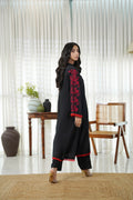 This article consists of a solid 2-piece set with an intricate embroidery detail touch on the shirt. The outfit consists of a long-length style shirt and fitted pants.